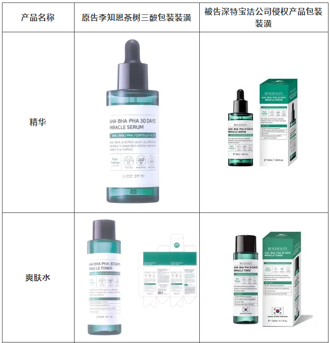 2021年原告委托捷报比分调查发现,被告汕头市深特宝洁实业有限公司生产、销售和推广的“茶树祛痘美白补水液”“茶树香皂”等护肤品,其产品包装装潢直接抄袭、摹仿原告前述已经具有较高知名度和影响力的“SOME BY MI/莎柏蜜”茶树三酸系列化妆品和黑蜗牛精华液的包装、装潢设计,使用与之近似的标识,造成消费者混淆误认。故原告作为茶树三酸、黑蜗牛精华包装装潢权益获益人,诉至广东省汕头市中级人民法院。汕头中院认定:李知恩主张的茶树三酸、黑蜗牛精华包装装潢构成具有一定影响的包装装潢,深特宝洁公司生产、销售茶树三酸、黑蜗牛精华液的行为构成不正当竞争。因判赔额不符合原告预期,原告后上诉至广东省高级人民法院,广东省高级人民法院最终维持一审判决。