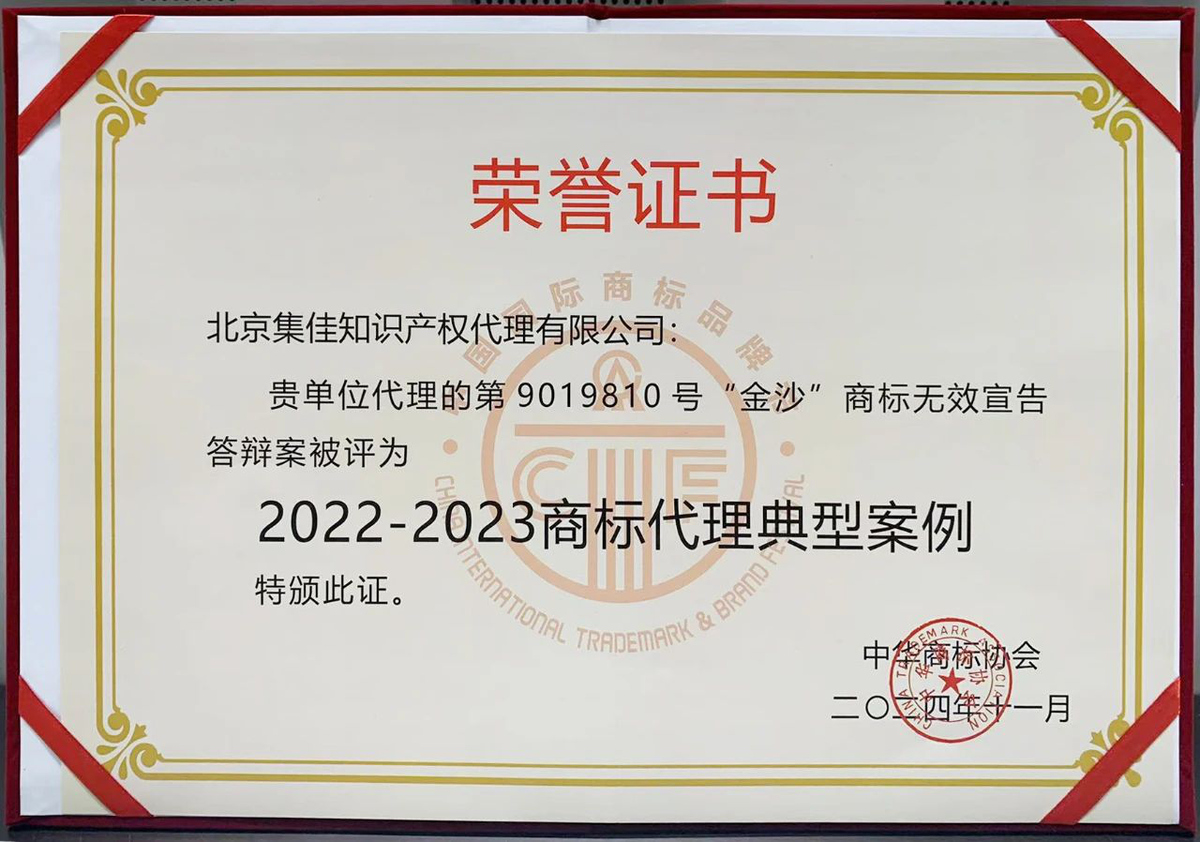 >捷报比分>关于我们>荣誉概览>2024>集佳代理的“金沙”商标权无效宣告答辩案入选“2022-2023商标代理典型案例”