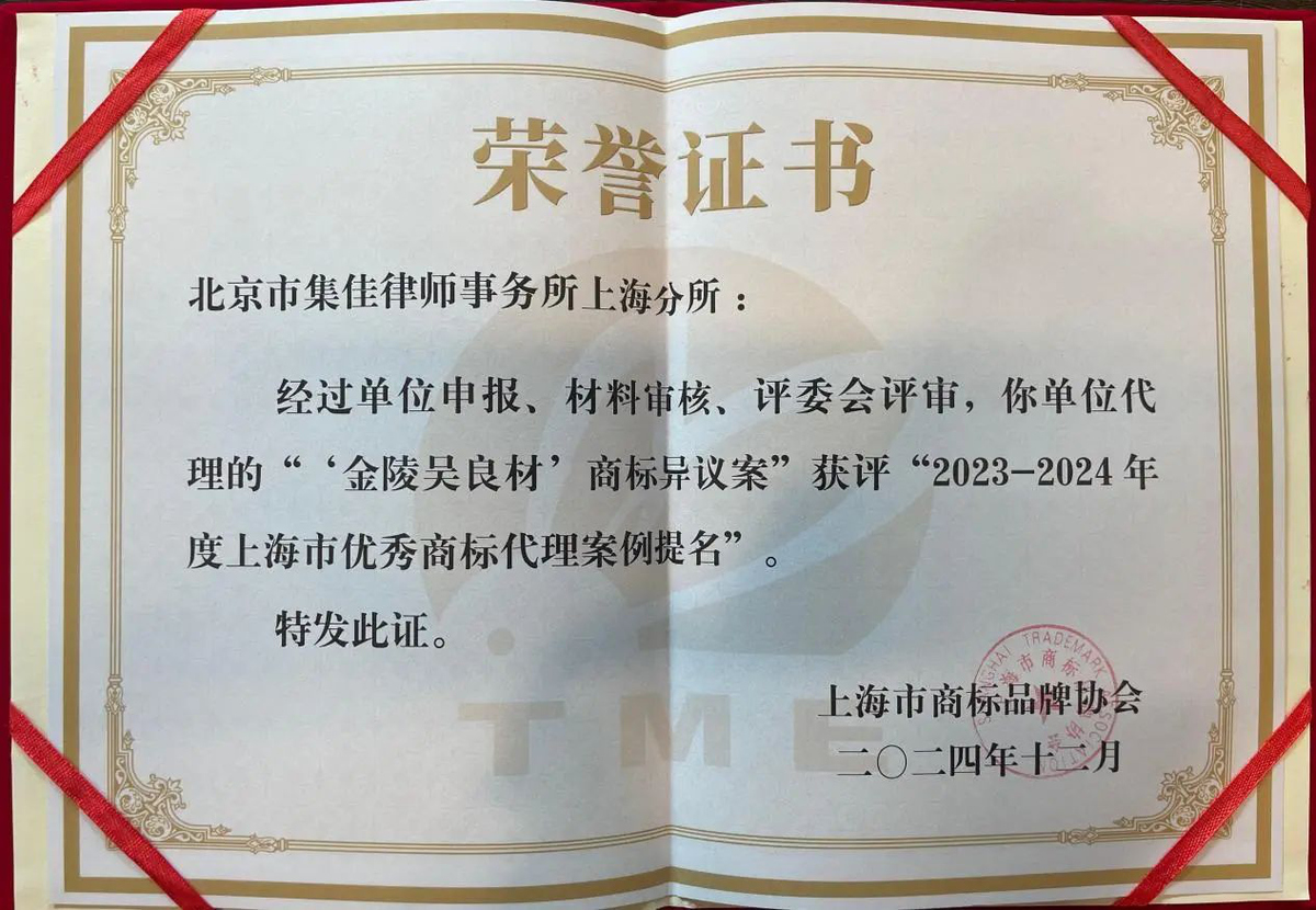案例二“金陵吴良才商标异议案”被评为上海市优秀商标代理案例提名