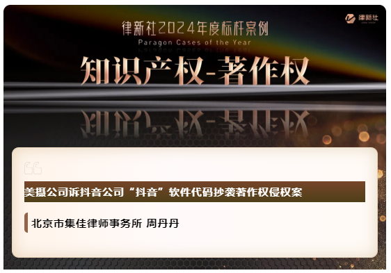 捷报比分凭借在知识产权保护领域卓越的专业实力与良好的行业口碑,入选《律所卓越品牌影响力指南(2024)》,荣获“律新社2024年度精品品牌律所30佳”奖项;同时,集佳周丹丹律师代理的“美摄公司诉抖音公司'抖音'软件代码抄袭著作权侵权案”获评“律新社2024年度标杆案例:知识产权-著作权领域”。